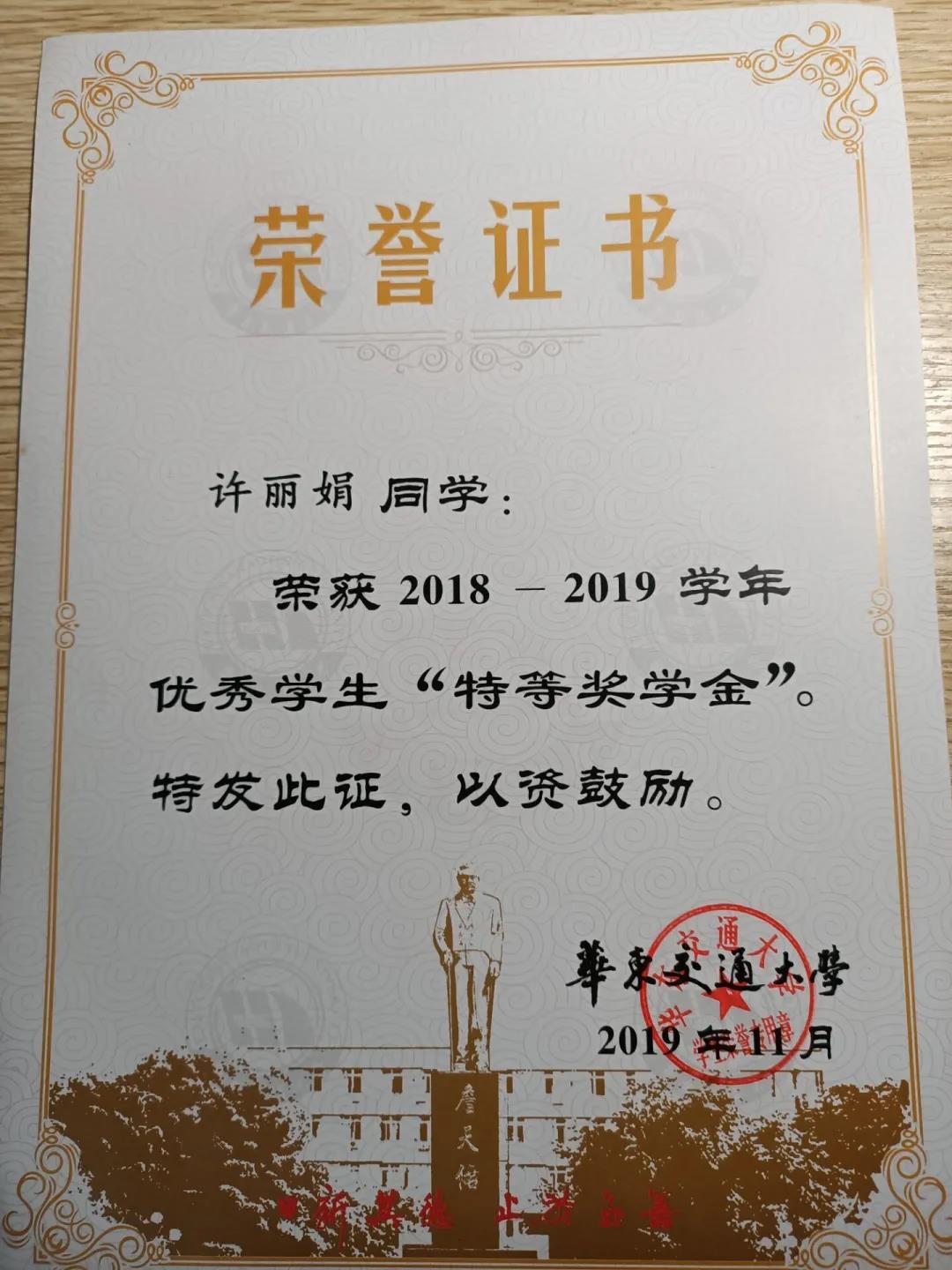 许丽娟,女,永利app,轨道交通信号与控制2017-1班员工,学习绩点4.0。在校期间获得2017-2018学年一等奖学金、2018-2019学年特等奖学金、2018-2019学年“三好员工”荣誉称号。现保研至西南交通大学。