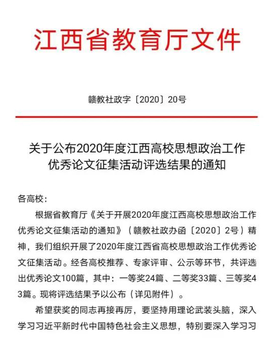 9月14日,江西省教育厅开展了2020年度江西省高校思想政治工作优秀论文征集活动。经各高校推荐、专家评审、公示等环节,共评选出优秀论文100篇,其中:一等奖24篇、二等奖33篇、三等奖43篇。其中公司苑莹老师的“重大应急事件下国内外高校员工管理对比”论文荣获2020年度江西高校思想政治工作优秀论文二等奖。