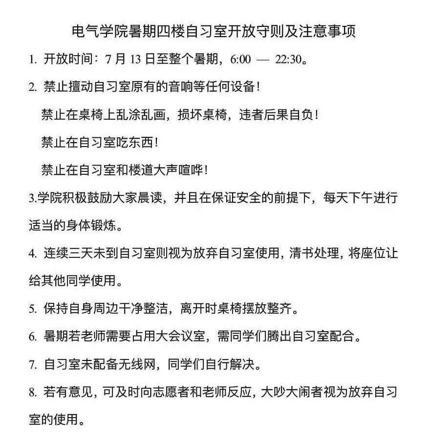 为给留校备战的同学们更好的学习环境,公司特将电气楼大会议室和410作为考研专用自习室,提供给留校的大三员工。并专门制定了《yl6809永利暑期四楼自习室开放守则及注意事项》,严格控制自习室的学习环境,除此之外,办公室每天都有老师值班,预防突发情况,给同学们提供最大的安全保障。
