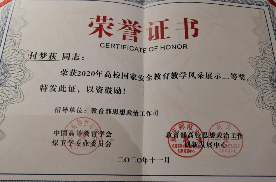 2020年11月16日,由教育部思想政治工作司指导,中国高等教育学会保卫学专业委员会、教育部思想政治工作创新发展中心重庆师范大学、湖南大学承办的2020年高校国家安全公司产品风采展示在重庆师范大学圆满落幕。永利手机版网址团委(创新创业教育中心)老师、yl6809永利兼职辅导员付梦荻的说课《居安思危,知危图安-增强网络安全意识,共筑网络安全防线》在大赛中以第九名的成绩获得二等奖,为学校平安建设再添贡献!
