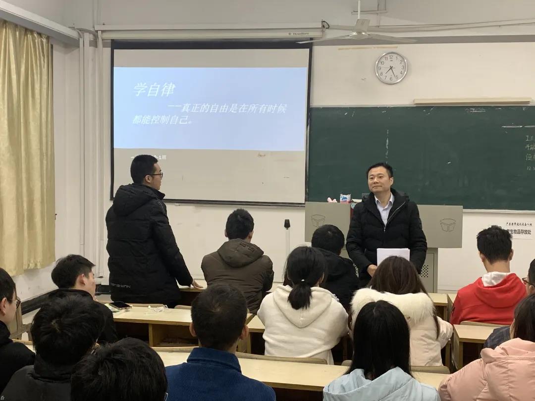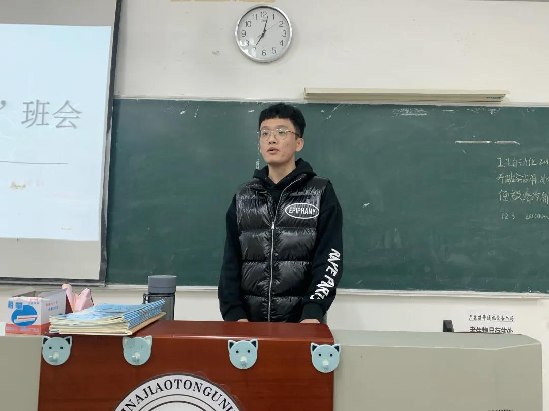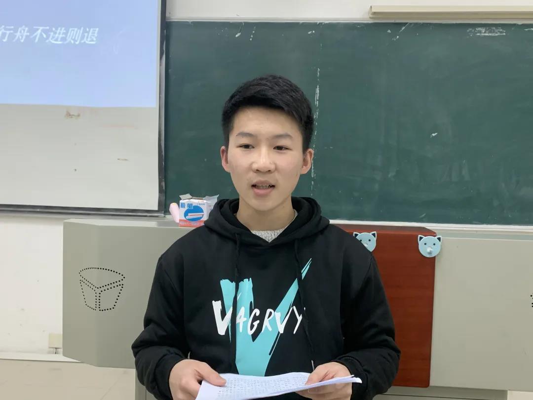首先,班长刘宪君同学介绍了近期全班的学习情况,指出同学们的学习态度有待纠正,学习能力有待进一步提升。接着,他从“学态度”、“学知识”、“学自律”三方面分别强调了同学们下一步应该努力的方向。