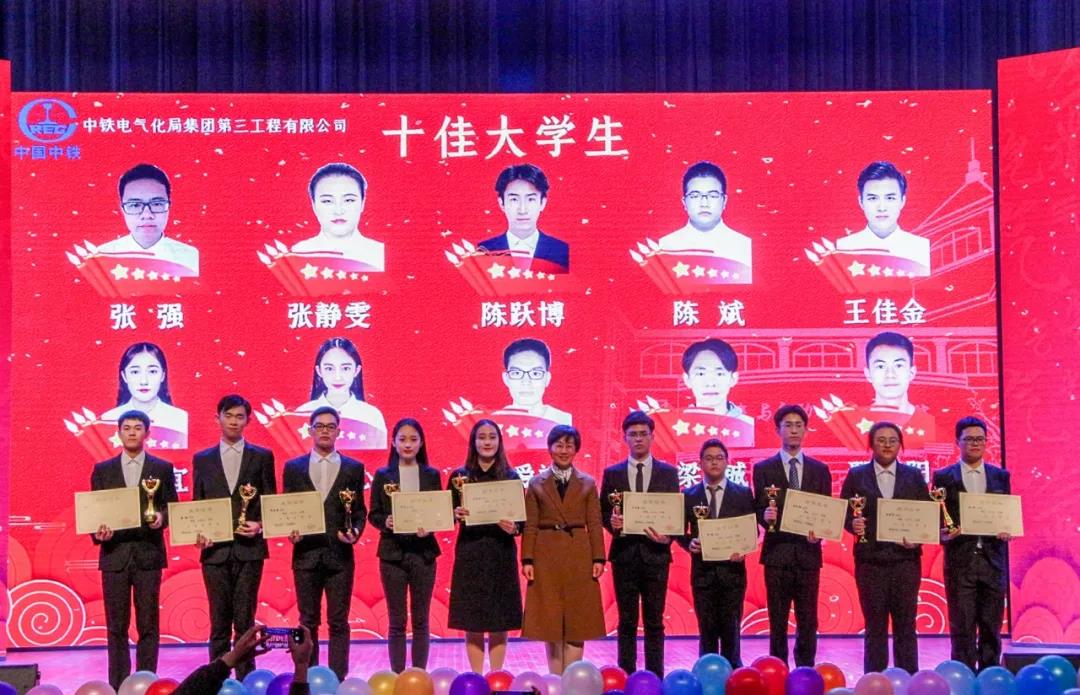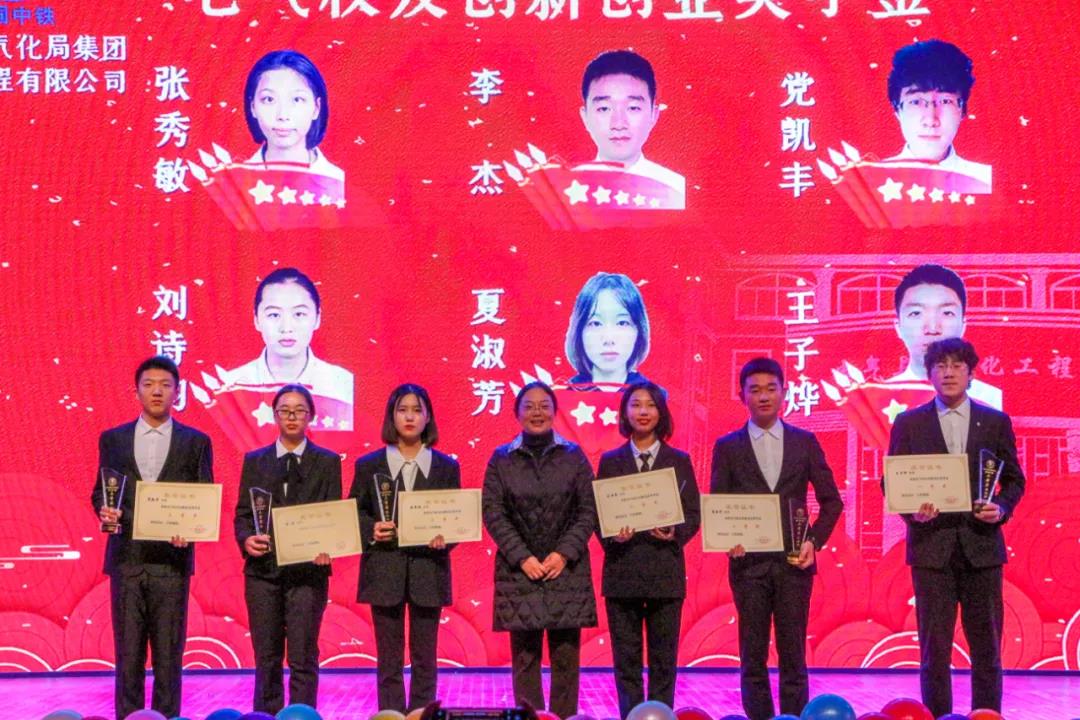 中铁电气化局三公司刘亚丽女士、优秀员工曹仲先生为学子们颁奖