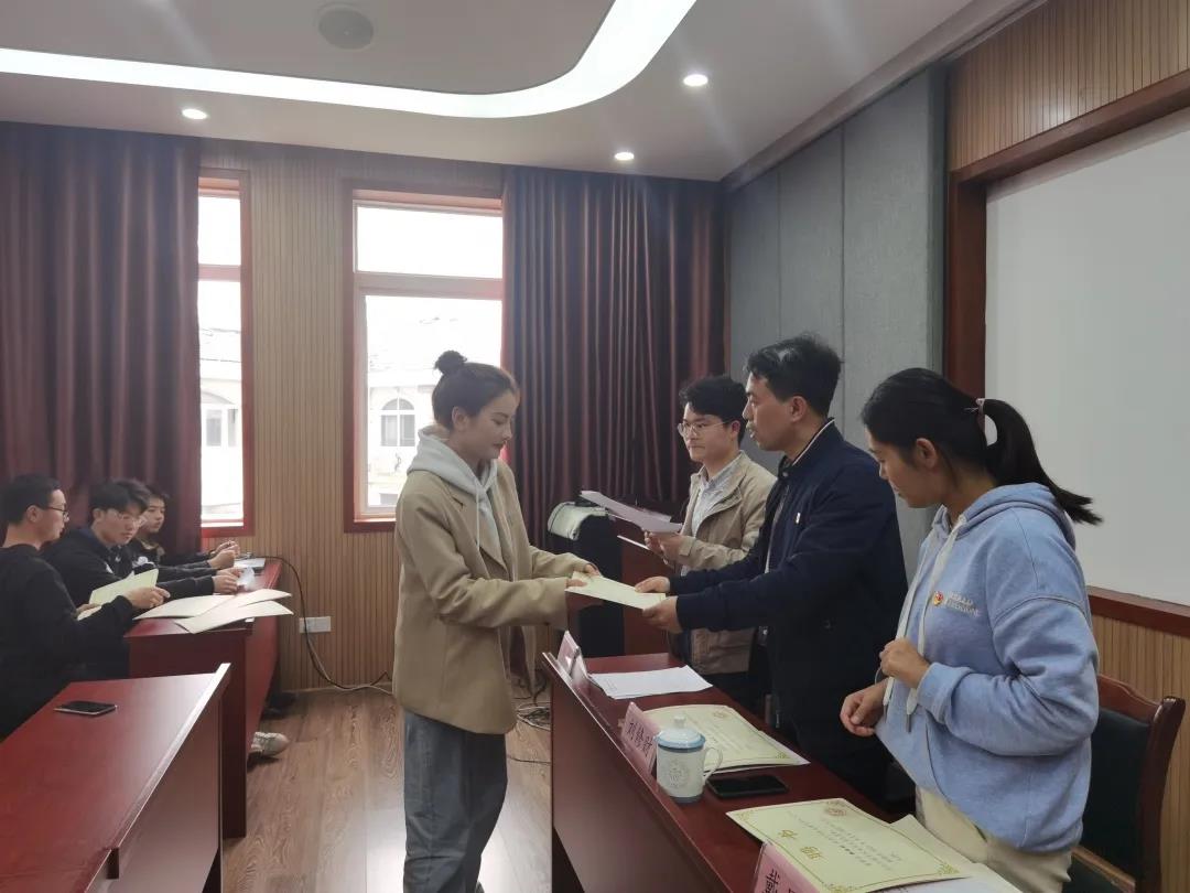 宣读完毕后,刘修财与戴晶晶为公司全体安全文明志愿者颁发聘书。