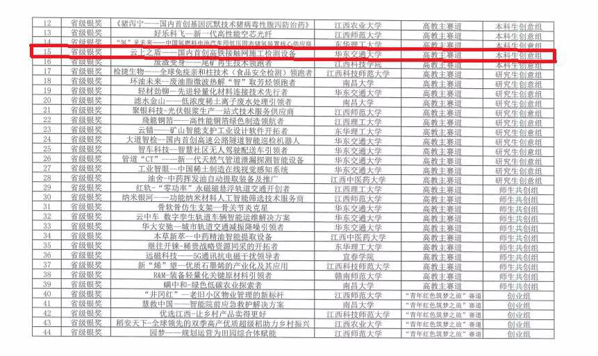 公司本科生创意组“云上之盾——国内首创高铁接触网施工检测设备”项目团队获“建行杯”第七届江西省“互联网+”老员工创新创业大赛省级银奖。