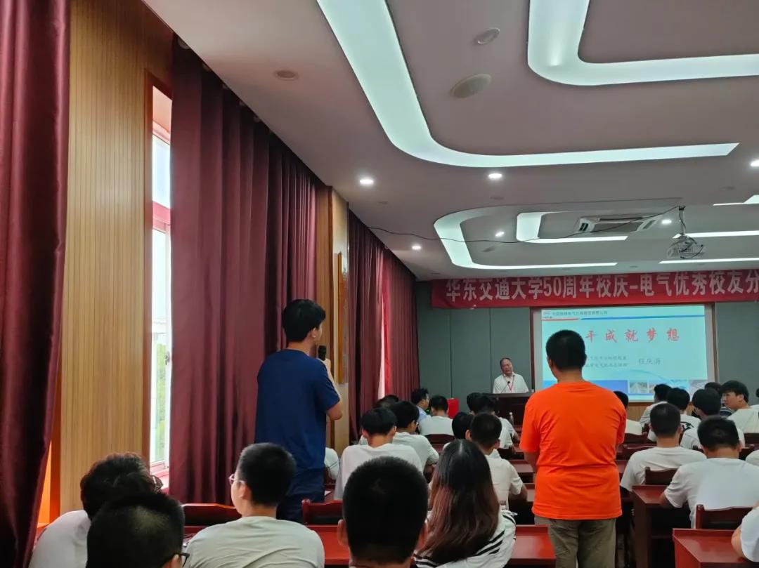 在交流互动环节,针对同学们提出的对铁路行业未来30年发展情况的疑问,程庆海表示,无论是高铁还是地铁,未来的发展前景都很广阔。铁路是国家的战略性、先导性、关键性重大基础设施,在经济社会发展中的地位和作用至关重要,因此电气化专业员工就业前景十分可观。对于临近毕业的师弟师妹们有关找工作的问题,程庆海提出建议:树立切实可行又能激发潜能的目标,科学合理规划未来生涯,脚踏实地走好每一步,遵纪守法尊重客观规律,勇于创新敢于受挫,心怀感恩诚信做人,一定能有所成就。